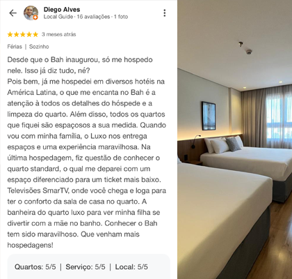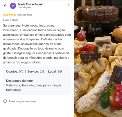 Temos como propósito oferecer uma experiência diferenciada aos nossos hóspedes. Proporcionando uma estadia com muito conforto e excelência no atendimento. Um hotel sofisticado e aconchegante na medida certa.